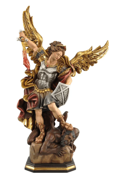 Saint Michael is depicted in a commanding stance, sword poised in triumph over the forces of evil, his wings spread in radiant protection. Every detail—from the expression of serene power on his face to the finely sculpted textures of his celestial armor—evokes the awe-inspiring role he plays as Heaven’s foremost warrior.